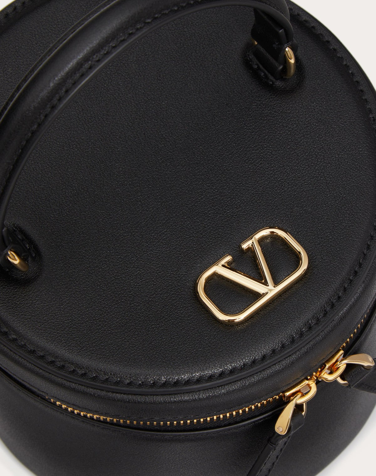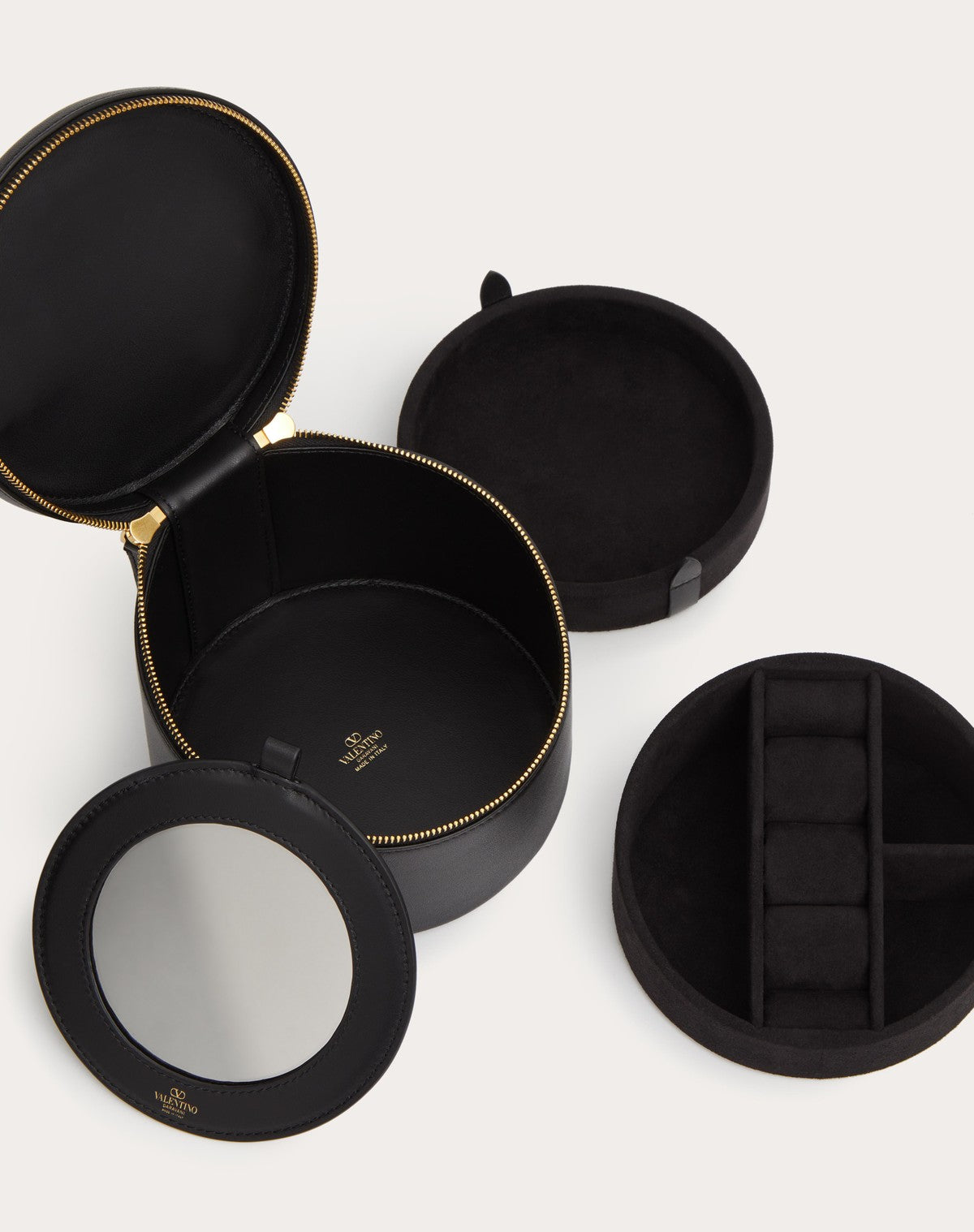Mini vanity porta gioielli Vlogo Signature Valentino Garavani in vitello. Può essere portato a mano grazie al manico superiore. - Logo e parti metalliche finitura colore oro chiaro - Chiusura a zip - Specchietto removibile - Fodera in Nappa. Interno: due vani portagioielli removibili rivestiti in Alcantara - Manico in pelle. Altezza (luce): 7 cm - Dimensioni: W14xH12(max),H9(min)xD14 cm - Made in Italy