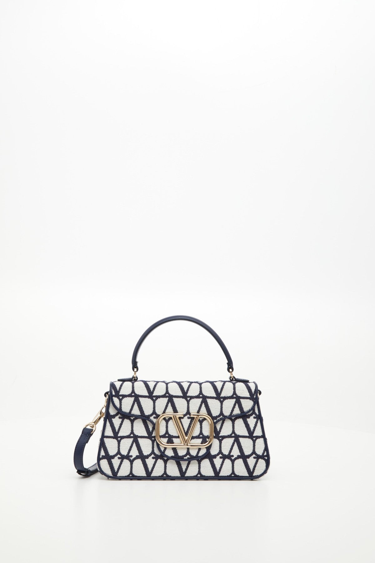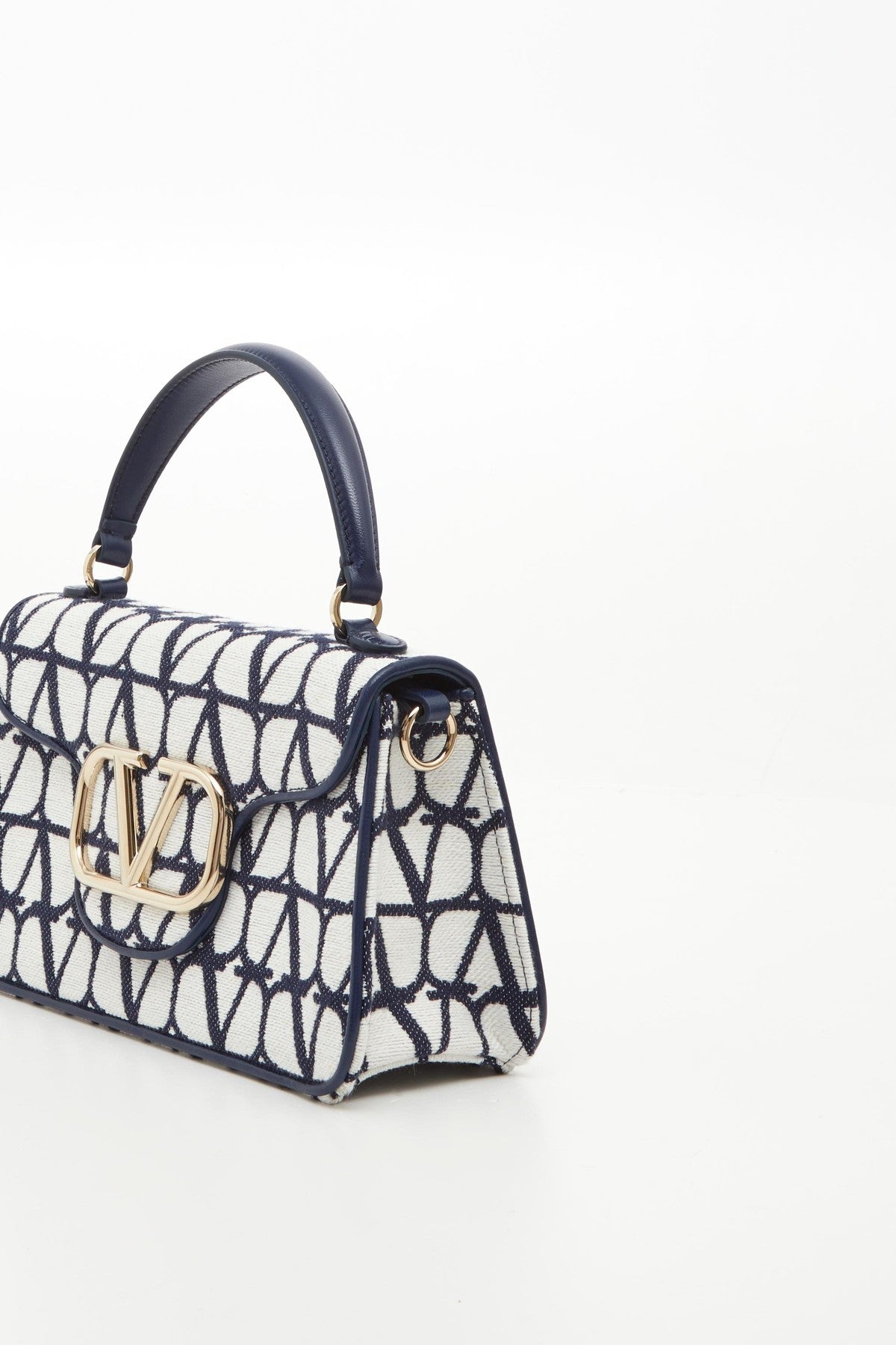 Borsa a mano piccola Valentino Garavani Locò in Toile Iconographe ed elemento VLogo Signature metallico. La borsa può essere indossata crossbody o a mano grazie alla tracolla e al manico.
