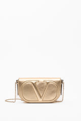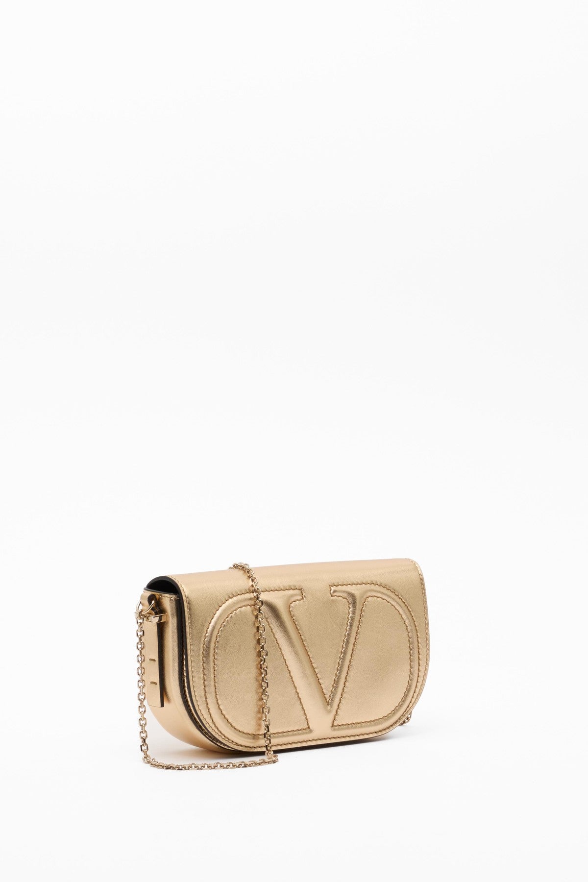 Pouch con catena Valentino Garavani VLogo Walk in nappa metallizzata con dettaglio VLogo Signature in rilievo.