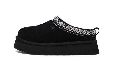UGG Tazz Black offre uno stelo in camoscio nero accompagnato da a Treccia grigia e bianca in poliestere riciclato. Il rivestimento nero è progettato in Uggplush, una lana riciclata mentre una suola compensata da 3,8 cm in Eva garantisce la manutenzione.