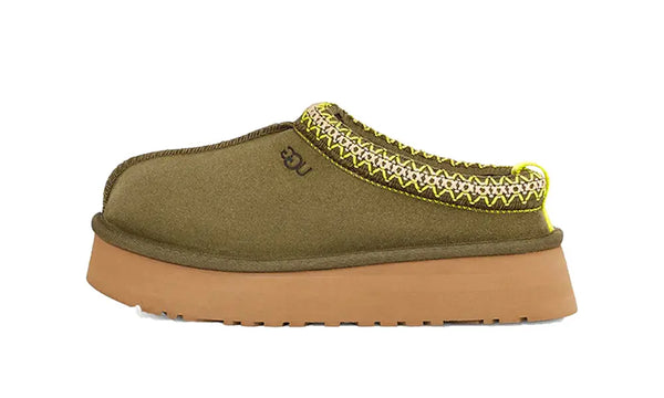 UGG Tazz Slippista bruciata Olive offre uno stelo in Suede verde olive accompagnato da a Treccia gialla e bianca in poliestere riciclato. C'è un cucito elevato che scorre attraverso la parte anteriore del piede e dà materiale. Il rivestimento è progettato in Uggplush, una lana riciclata mentre una suola compensata da 3,8 cm in Clear Brown Eva Garantisce conforto.