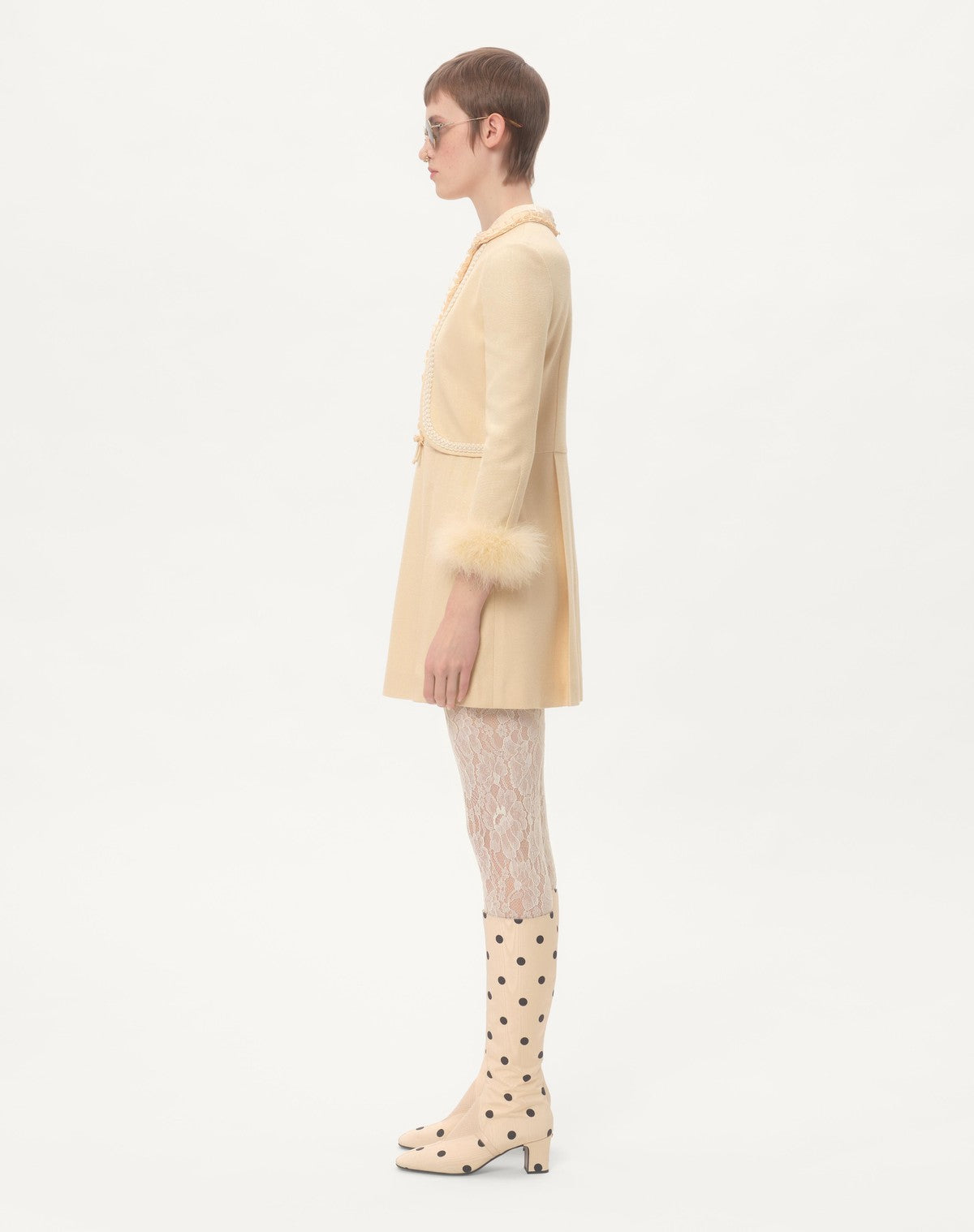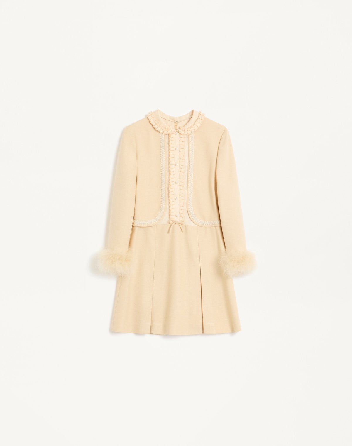 Abito corto in Rustik Silk con inserti in Silk Jaquard Toute la V su corpino e dettaglio di Boa di Piume
