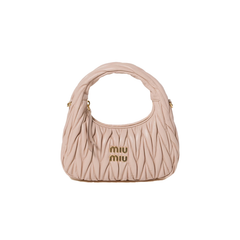 La borsa Wander viene reinterpretata stagione dopo stagione diventando un accessorio iconico delle collezioni Miu Miu. Realizzata in nappa matelassé, la borsa è caratterizzata dall'effetto tridimensionale e sofisticato dato dalla pregiata lavorazione. La forma hobo, tra ispirazioni rétro ed eleganza contemporanea, diventa nuovo sinonimo di moderna femminilità.