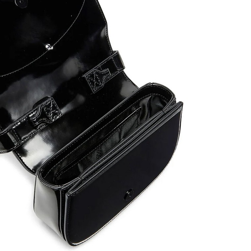 A structured and compact women's bag with a shoulder handle and optional crossbody strap. The galvanized 'oval D' tag on the flap complements the polished, mirrored leather body.