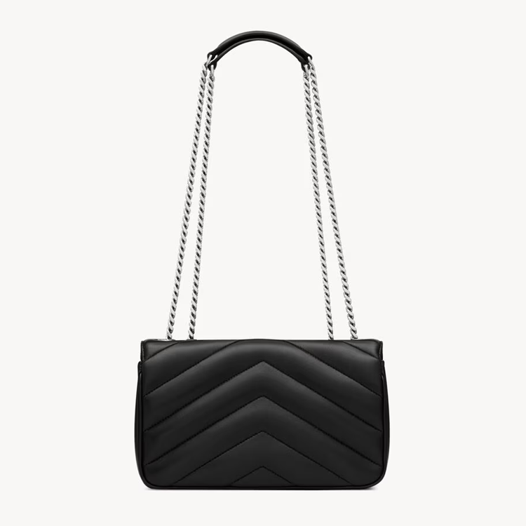La borsa, completata da una tracolla a catena scorrevole, può essere portata a spalla o a tracolla.