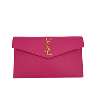 Pochette Envelope piccola con patta, decorata con iniziali YSL intrecciate in metallo.