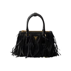 La borsa Prada Galleria è reinterpretata per la collezione Autunno/Inverno 2024 con volumi eccentrici e dettagli dall’allure retrò. La silhouette senza tempo, interamente ricoperta di piume applicate a mano, è trasformata in un oggetto prezioso, un gioiello di artigianalità dall’eleganza iconica.