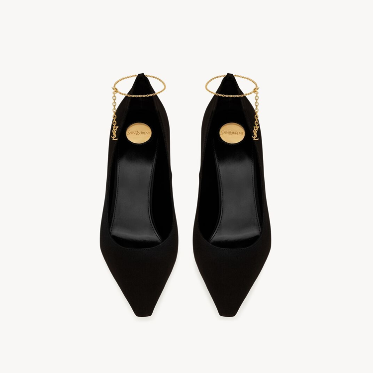 Décolleté a punta affusolata con tacco a spillo svasato e cavigliera a catena con charm Cassandre.Dimensione tacco 11cm.